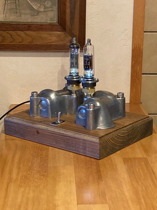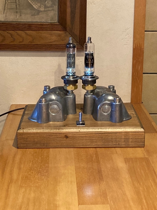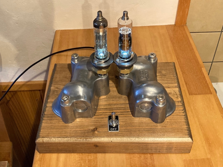 そこの上に真空管を付けその下にある12VのLEDを点灯させて真空管をあからせています(下側が少しあかる程度ですが)。