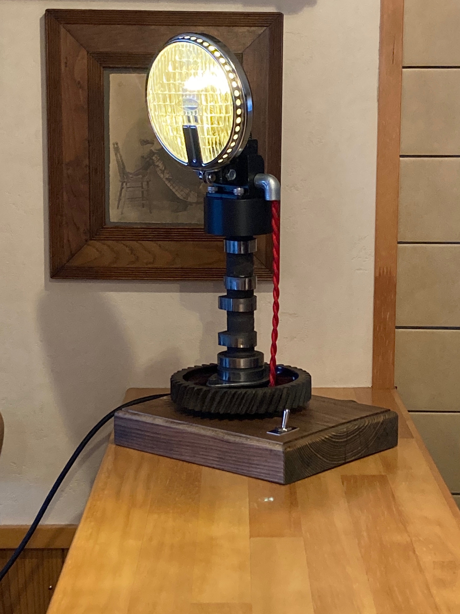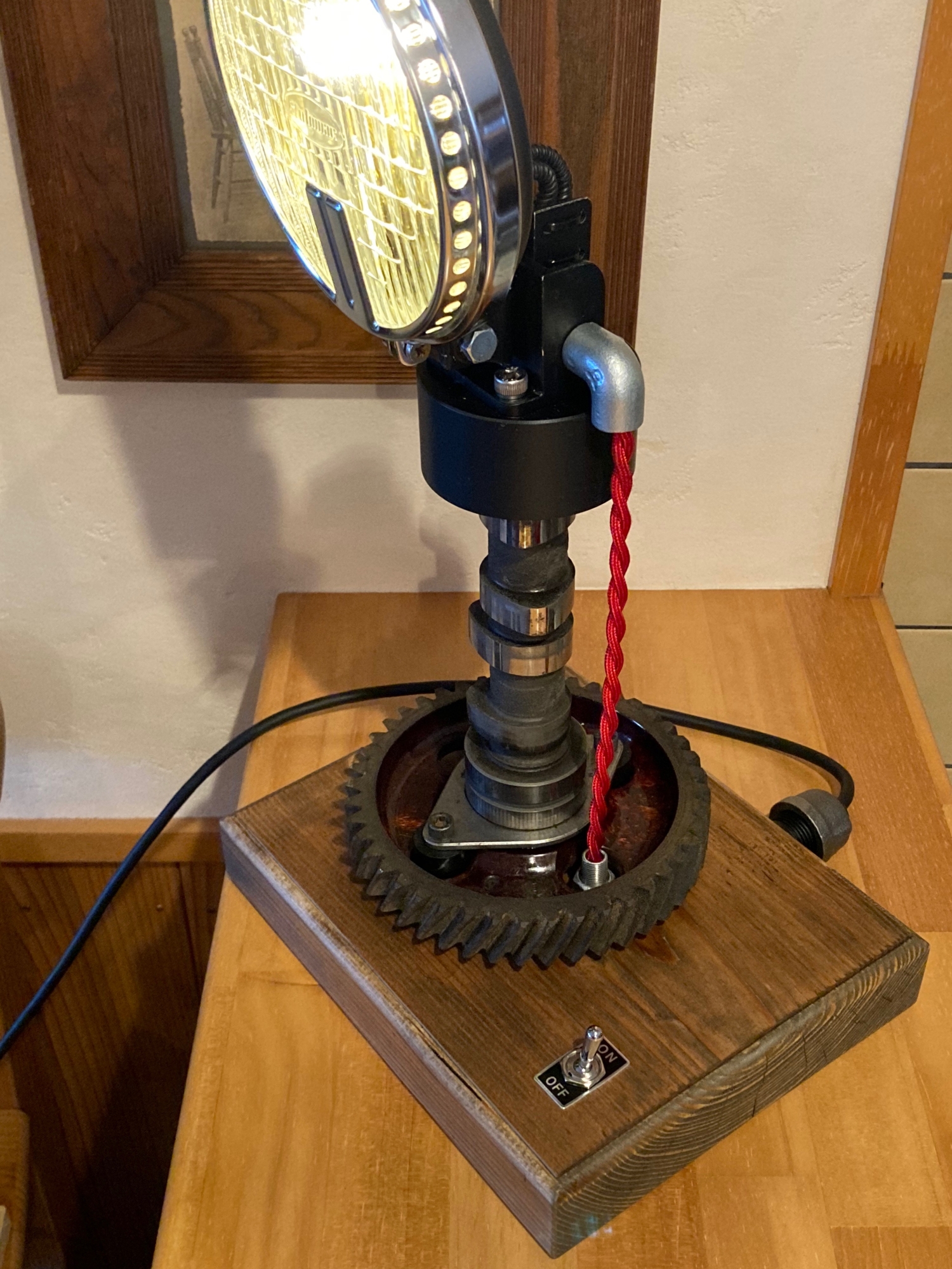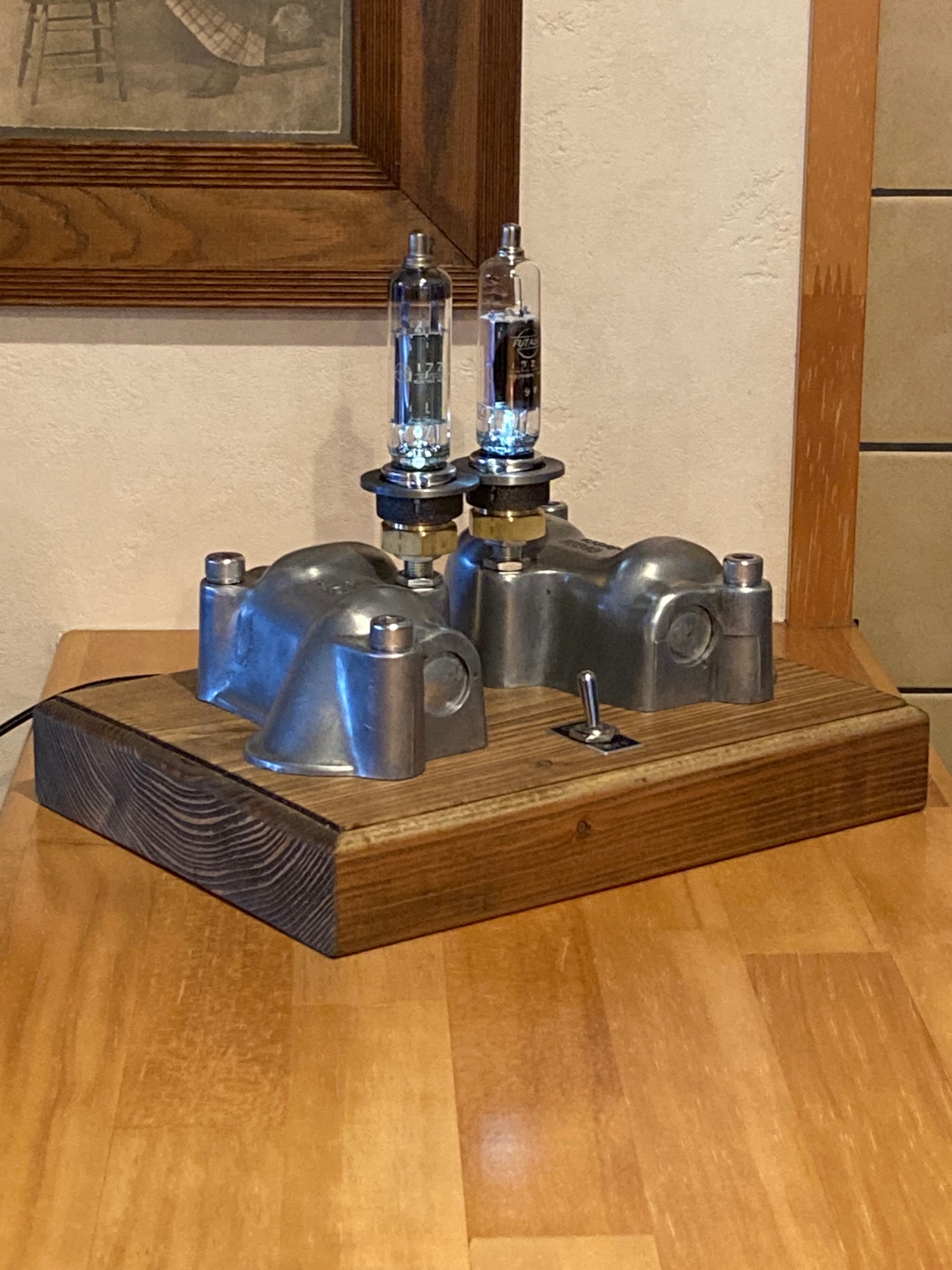 木材の台の上に配置して中央にトグルスイッチをつけています。